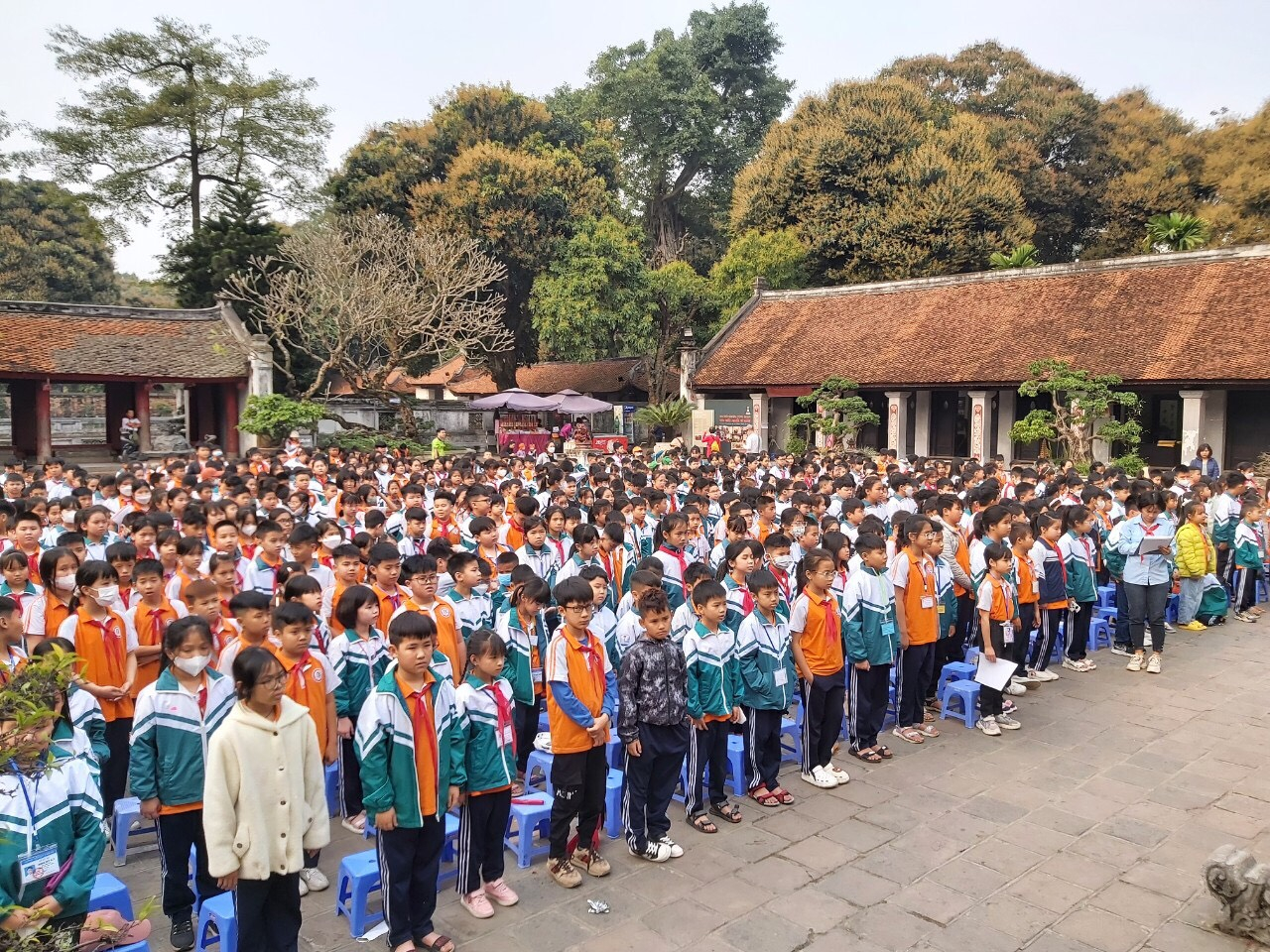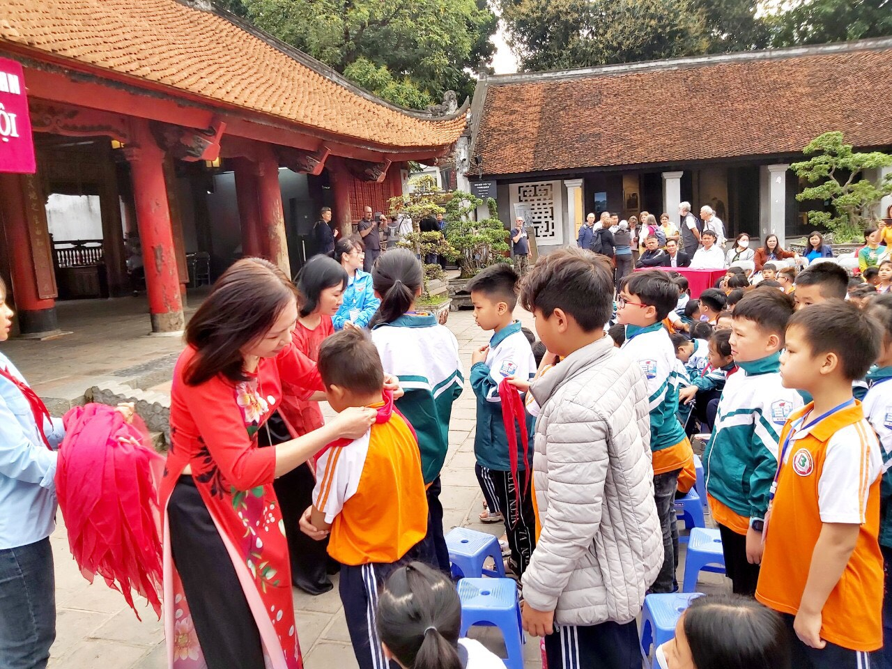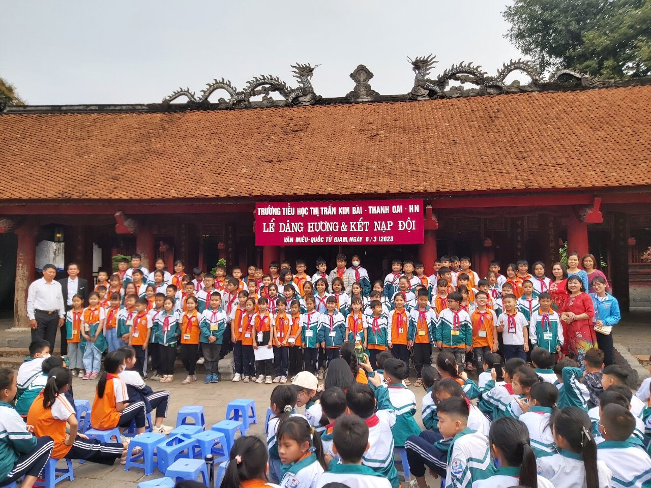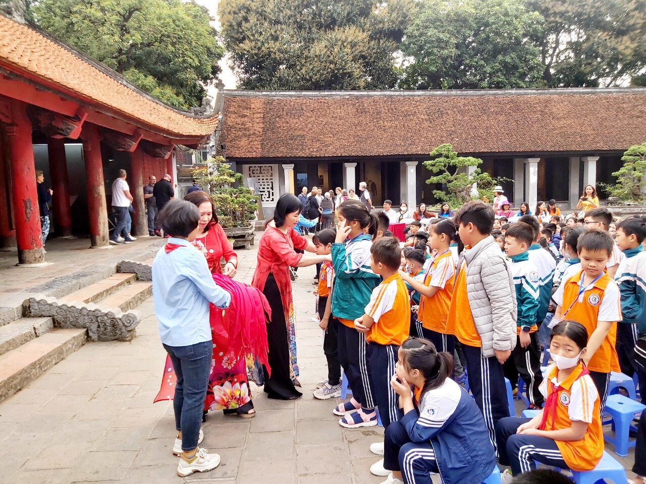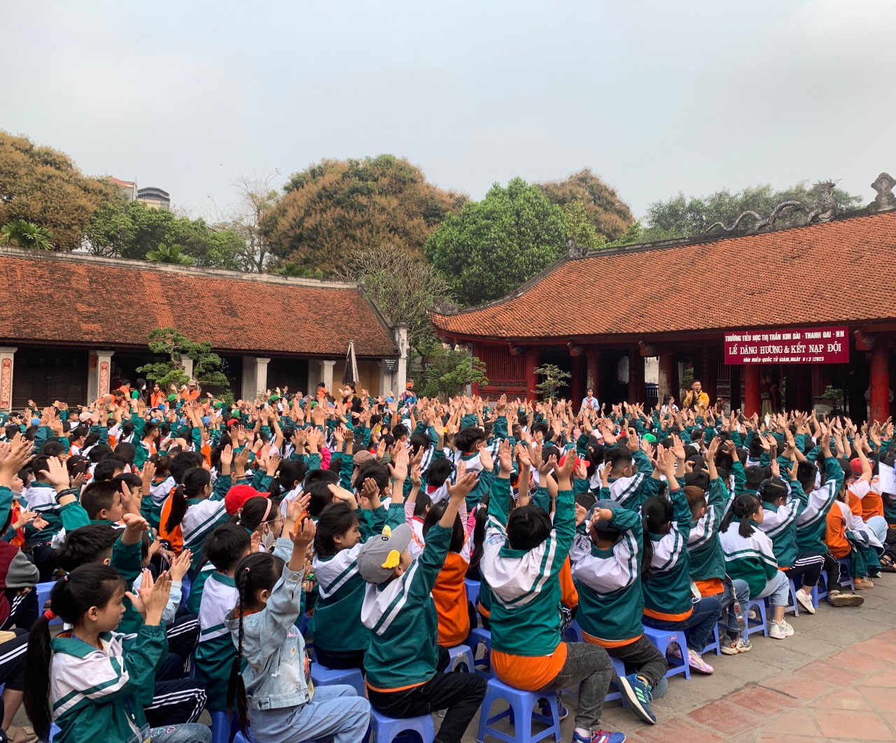 Sau đó Liên đội còn tổ chức Lễ kết nạp đội viên cho 79 em thiếu niên, nhi đồng có thành tích xuất sắc trong tu dưỡng, rèn luyện và học tập. Được đứng trong hàng ngũ của Đội TNTPHCM là một vinh dự lớn của các em, hôm nay các em còn được kết nạp tại Văn Miếu – Quốc Tử Giám nơi không chỉ là trường đại học đầu tiên của nước ta mà còn như một ngọn nến luôn rực cháy, thắp sáng truyền thống hiếu học của người Việt. Chắc chắn các em sẽ dường như được tiếp thêm động lực từ những bảng vàng rực rỡ của ông cha, nạp vào nguồn năng lượng tràn đầy để vững tin trong hành trình nỗ lực học tập và khám phá tri thức nhân loại.