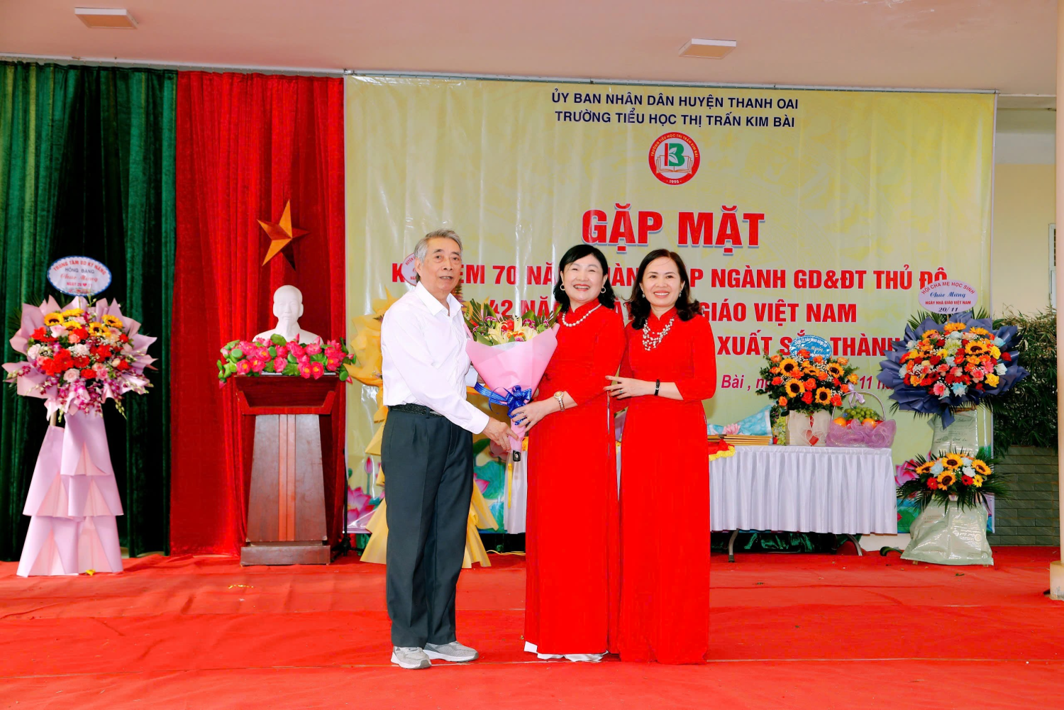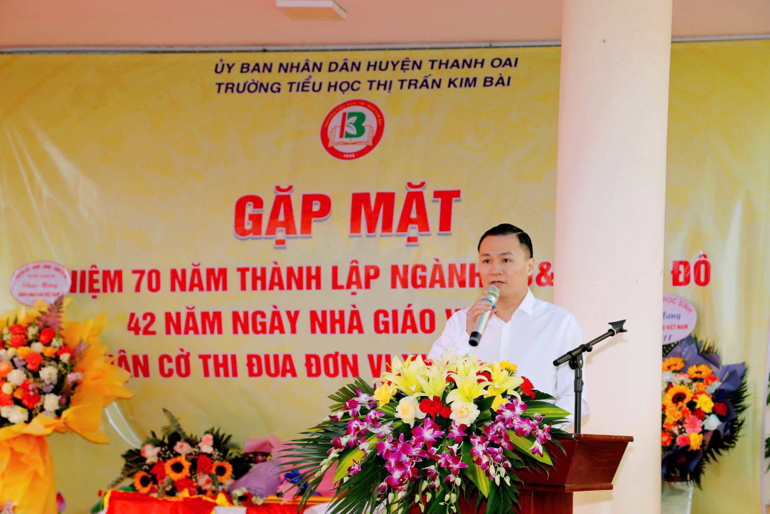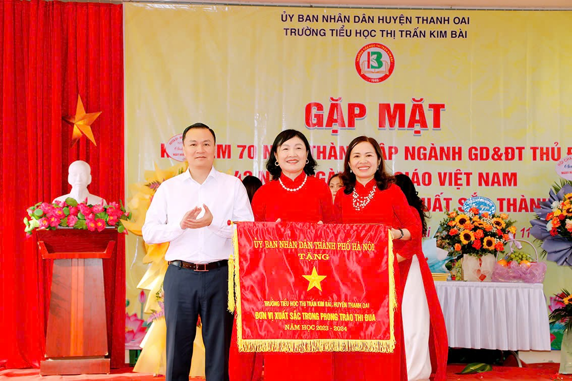 Ông Vũ Quỳnh – Huyện ủy viên, Phó Chủ tịch UBND huyện Thanh Oai trao Cờ đơn vị xuất sắc trong phong trào thi đua năm học 2023 - 2024 của UBND thành phố Hà Nội cho trường Tiểu học thị trấn Kim Bài Về dự buổi gặp mặt kỷ niệm 70 năm thành lập ngành Giáo dục và Đào tạo Thủ đô (1954-2024), 42 năm ngày nhà giáo Việt Nam (20/11/1982 - 20/11/2024) và đón nhận Cờ thi đua đơn vị dẫn đầu khối Tiểu học thuộc ngành Giáo dục và Đào tạo Hà Nội năm học 2024-2025, nhà trường rất vinh dự được đón tiếp ông Vũ Quỳnh – Huyện ủy viên, Phó Chủ tịch UBND huyện Thanh Oai; bà Nguyễn Thúy Mai – Chủ tịch Hội Liên hiệp phụ nữ huyện Thanh Oai; nhà giáo Nguyễn Thị Anh Đào – Phó trưởng phòng Giáo dục và Đào tạo huyện Thanh Oai;ông Hoàng Quốc Đạt – Huyện ủy viên, Bí thư Đảng ủy cùng các ông bà là trưởng các ban ngành đoàn thể của thị trấn Kim Bài; nhà giáo Đỗ Tiến – nguyên là Trưởng phòng Giáo dục và Đào tạo Thanh Oai; nhà giáo Mai Đức Nguyên - nguyên là Phó Trưởng phòng Giáo dục và Đào tạo Thanh Oai; nhà giáo Lê Đình Thịnh, nhà giáo Tô Văn Thức nguyên là Hiệu trưởng nhà trường. Ban đại diện CMHS, quý thầy giáo, cô giáo đang công tác và đã nghỉ hưu của trường, cùng toàn thể các em học sinh nhà trường. Các đại biểu tham dự buổi lễ Những năm qua, trường Tiểu học thị trấn Kim Bàiđã nỗ lực, đổi mới sáng tạo trong công tác giáo dục và đạt nhiều thành tích quan trọng. Cơ sở vật chất được tăng cường khang trang, đội ngũ được chuẩn hóa. Các phong trào, hoạt động giáo dục của trường ngày càng phát triển. Nhà trường đã hoàn thành xuất sắc các nhiệm vụ được giao, đóng góp tích cực vào công tác nâng cao dân trí, đào tạo nhân lực, bồi dưỡng nhân tài cho quê hương, đất nước. Chất lượng giáo dục đại trà, mũi nhọn được duy trì và không ngừng nâng được cao cả về số lượng và chất lượng. Chất lượng kiểm tra cuối mỗi năm học ở tất cả các khối lớp đạt và vượt bình quân chung toàn huyện, trong đó tỷ lệ học sinh HTTNV và HTXSNV luôn đạt từ 85 - 95%. Tỷ lệ học sinh lớp 5 hoàn thành chương trình tiểu học luôn đạt 100%. Thi học sinh giỏi các cấp đều đạt kết quả cao. Hiện nay, nhà trường có 20 lớp học với 800 học sinh. Nhờ làm tốt công tác xã hội hóa giáo dục, huy động được sự chung tay, ủng hộ của phụ huynh học sinh đã góp phần tăng cường cơ sở vật chất, hỗ trợ các hoạt động giáo dục, đáp ứng yêu cầu của Chương trình Giáo dục phổ thông 2018. Đội ngũ cán bộ quản lý, giáo viên của trường luôn tâm huyết, trách nhiệm, không ngừng phấn đấu vươn lên hoàn thành tốt nhiệm vụ được giao; luôn yêu nghề, có đạo đức tốt, năng lực chuyên môn nghiệp vụ vững vàng, nhiều giáo viên giỏi cấp thành phố. Năm 2021, trường được công nhận “Trường Tiểu học đạt chuẩn Quốc gia Mức độ 2”. Năm học 2021- 2022 nhà trường được UBND Thành phố Hà Nội tặng danh hiệu “Tập thể Lao động xuất sắc”. Năm học 2022- 2023: Đón Bằng khen của UBND Thành phố Hà Nội. Năm học 2023- 2024 trường rất vinh dự được UBND thành phố Hà Nội tặng Cờ thi đua đơn vị xuất sắc trong phong trào thi đua. Tại buổi gặp mặt hôm nay, trường Tiểu học thị trấn Kim Bài đã vinh dự đón nhận Cờ thi đua đơn vị dẫn đầu khối Tiểu học trong phong trào thi đua năm học 2023 - 2024. Liên đội được Trung ương Đoàn tặng Bằng khen; 02 cá nhân được Trung Ương Đoàn, thành Đoàn tặng Bằng khen, 06 cá nhân được UBND huyện tặng danh hiệu Chiến sĩ thi đua cơ sở. Thay mặt Huyện ủy, HĐND, UBND huyện Thanh Oai, ông Vũ Quỳnh chúc mừng thành tích đạt được của nhà trường; chúc mừng các thầy, cô giáo nhân dịp 20/11; ghi nhận sự quan tâm chăm lo của lãnh đạo thị trấn, Phòng Giáo dục và Đào tạo, các ban, ngành của huyện, thị trấn cho sự nghiệp giáo dục của huyện nói chung và phong trào giáo dục của trường Tiểu học thị trấn Kim Bài nói riêng. Ông yêu cầu đội ngũ các thầy cô giáo nhà trường cần tiếp tục tu dưỡng, trau dồi phẩm chất đạo đức, nâng cao nhận thức và rèn luyện kỹ năng nghề nghiệp, xây dựng tập thể đoàn kết, khắc phục khó khăn tiếp tục hoàn thành xuất sắc nhiệm vụ, xứng đáng là đơn vị xuất sắc trong các phong trào thi đua của ngành giáo dục và đào tạo thành phố Hà Nội. Hôm nay ôn lại truyền thống vẻ vang của ngành, của trường, chúng ta rất tự hào về những thành quả đã đạt được và cũng nhận rõ hơn trách nhiệm của nhà giáo trong giai đoạn hiện nay là không ngừng học tập nâng cao trình độ chuyên môn, hiểu biết xã hội, luôn tu dưỡng “Mỗi thầy giáo, cô giáo là một tấm gương đạo đức tự học và sáng tạo”, tự hoàn thiện mình theo “chuẩn” giáo viên Tiểu học nhằm đáp ứng nhiệm vụ thực hiện Chương trình giáo dục phổ thông 2018 hiện nay và trong những năm đến. Tập thể sư phạm nhà trường sẽ luôn nêu cao truyền thống
