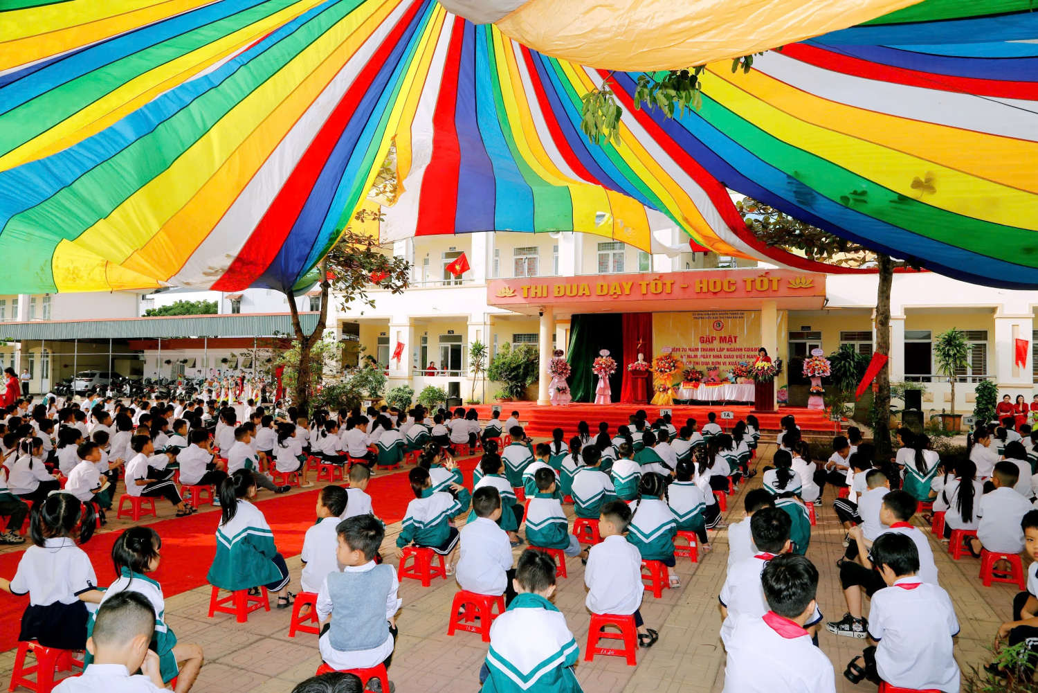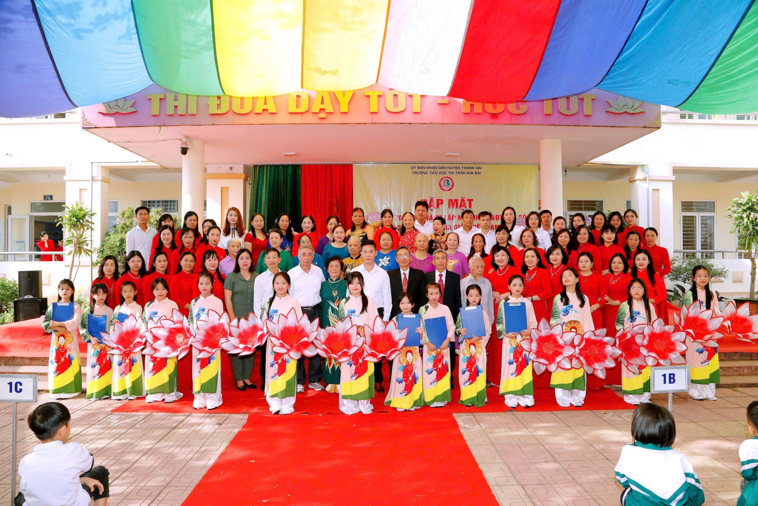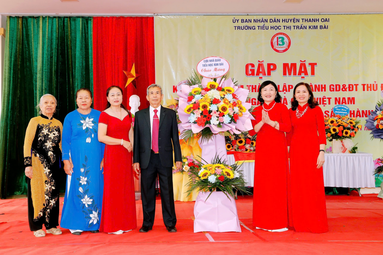 Ông Vũ Quỳnh – Huyện ủy viên, Phó Chủ tịch UBND huyện Thanh Oai trao Cờ đơn vị xuất sắc trong phong trào thi đua năm học 2023 - 2024 của UBND thành phố Hà Nội cho trường Tiểu học thị trấn Kim Bài Về dự buổi gặp mặt kỷ niệm 70 năm thành lập ngành Giáo dục và Đào tạo Thủ đô (1954-2024), 42 năm ngày nhà giáo Việt Nam (20/11/1982 - 20/11/2024) và đón nhận Cờ thi đua đơn vị dẫn đầu khối Tiểu học thuộc ngành Giáo dục và Đào tạo Hà Nội năm học 2024-2025, nhà trường rất vinh dự được đón tiếp ông Vũ Quỳnh – Huyện ủy viên, Phó Chủ tịch UBND huyện Thanh Oai; bà Nguyễn Thúy Mai – Chủ tịch Hội Liên hiệp phụ nữ huyện Thanh Oai; nhà giáo Nguyễn Thị Anh Đào – Phó trưởng phòng Giáo dục và Đào tạo huyện Thanh Oai;ông Hoàng Quốc Đạt – Huyện ủy viên, Bí thư Đảng ủy cùng các ông bà là trưởng các ban ngành đoàn thể của thị trấn Kim Bài; nhà giáo Đỗ Tiến – nguyên là Trưởng phòng Giáo dục và Đào tạo Thanh Oai; nhà giáo Mai Đức Nguyên - nguyên là Phó Trưởng phòng Giáo dục và Đào tạo Thanh Oai; nhà giáo Lê Đình Thịnh, nhà giáo Tô Văn Thức nguyên là Hiệu trưởng nhà trường. Ban đại diện CMHS, quý thầy giáo, cô giáo đang công tác và đã nghỉ hưu của trường, cùng toàn thể các em học sinh nhà trường. Các đại biểu tham dự buổi lễ Những năm qua, trường Tiểu học thị trấn Kim Bàiđã nỗ lực, đổi mới sáng tạo trong công tác giáo dục và đạt nhiều thành tích quan trọng. Cơ sở vật chất được tăng cường khang trang, đội ngũ được chuẩn hóa. Các phong trào, hoạt động giáo dục của trường ngày càng phát triển. Nhà trường đã hoàn thành xuất sắc các nhiệm vụ được giao, đóng góp tích cực vào công tác nâng cao dân trí, đào tạo nhân lực, bồi dưỡng nhân tài cho quê hương, đất nước. Chất lượng giáo dục đại trà, mũi nhọn được duy trì và không ngừng nâng được cao cả về số lượng và chất lượng. Chất lượng kiểm tra cuối mỗi năm học ở tất cả các khối lớp đạt và vượt bình quân chung toàn huyện, trong đó tỷ lệ học sinh HTTNV và HTXSNV luôn đạt từ 85 - 95%. Tỷ lệ học sinh lớp 5 hoàn thành chương trình tiểu học luôn đạt 100%. Thi học sinh giỏi các cấp đều đạt kết quả cao. Hiện nay, nhà trường có 20 lớp học với 800 học sinh. Nhờ làm tốt công tác xã hội hóa giáo dục, huy động được sự chung tay, ủng hộ của phụ huynh học sinh đã góp phần tăng cường cơ sở vật chất, hỗ trợ các hoạt động giáo dục, đáp ứng yêu cầu của Chương trình Giáo dục phổ thông 2018. Đội ngũ cán bộ quản lý, giáo viên của trường luôn tâm huyết, trách nhiệm, không ngừng phấn đấu vươn lên hoàn thành tốt nhiệm vụ được giao; luôn yêu nghề, có đạo đức tốt, năng lực chuyên môn nghiệp vụ vững vàng, nhiều giáo viên giỏi cấp thành phố. Năm 2021, trường được công nhận “Trường Tiểu học đạt chuẩn Quốc gia Mức độ 2”. Năm học 2021- 2022 nhà trường được UBND Thành phố Hà Nội tặng danh hiệu “Tập thể Lao động xuất sắc”. Năm học 2022- 2023: Đón Bằng khen của UBND Thành phố Hà Nội. Năm học 2023- 2024 trường rất vinh dự được UBND thành phố Hà Nội tặng Cờ thi đua đơn vị xuất sắc trong phong trào thi đua. Tại buổi gặp mặt hôm nay, trường Tiểu học thị trấn Kim Bài đã vinh dự đón nhận Cờ thi đua đơn vị dẫn đầu khối Tiểu học trong phong trào thi đua năm học 2023 - 2024. Liên đội được Trung ương Đoàn tặng Bằng khen; 02 cá nhân được Trung Ương Đoàn, thành Đoàn tặng Bằng khen, 06 cá nhân được UBND huyện tặng danh hiệu Chiến sĩ thi đua cơ sở. Thay mặt Huyện ủy, HĐND, UBND huyện Thanh Oai, ông Vũ Quỳnh chúc mừng thành tích đạt được của nhà trường; chúc mừng các thầy, cô giáo nhân dịp 20/11; ghi nhận sự quan tâm chăm lo của lãnh đạo thị trấn, Phòng Giáo dục và Đào tạo, các ban, ngành của huyện, thị trấn cho sự nghiệp giáo dục của huyện nói chung và phong trào giáo dục của trường Tiểu học thị trấn Kim Bài nói riêng. Ông yêu cầu đội ngũ các thầy cô giáo nhà trường cần tiếp tục tu dưỡng, trau dồi phẩm chất đạo đức, nâng cao nhận thức và rèn luyện kỹ năng nghề nghiệp, xây dựng tập thể đoàn kết, khắc phục khó khăn tiếp tục hoàn thành xuất sắc nhiệm vụ, xứng đáng là đơn vị xuất sắc trong các phong trào thi đua của ngành giáo dục và đào tạo thành phố Hà Nội. Hôm nay ôn lại truyền thống vẻ vang của ngành, của trường, chúng ta rất tự hào về những thành quả đã đạt được và cũng nhận rõ hơn trách nhiệm của nhà giáo trong giai đoạn hiện nay là không ngừng học tập nâng cao trình độ chuyên môn, hiểu biết xã hội, luôn tu dưỡng “Mỗi thầy giáo, cô giáo là một tấm gương đạo đức tự học và sáng tạo”, tự hoàn thiện mình theo “chuẩn” giáo viên Tiểu học nhằm đáp ứng nhiệm vụ thực hiện Chương trình giáo dục phổ thông 2018 hiện nay và trong những năm đến. Tập thể sư phạm nhà trường sẽ luôn nêu cao truyền thống