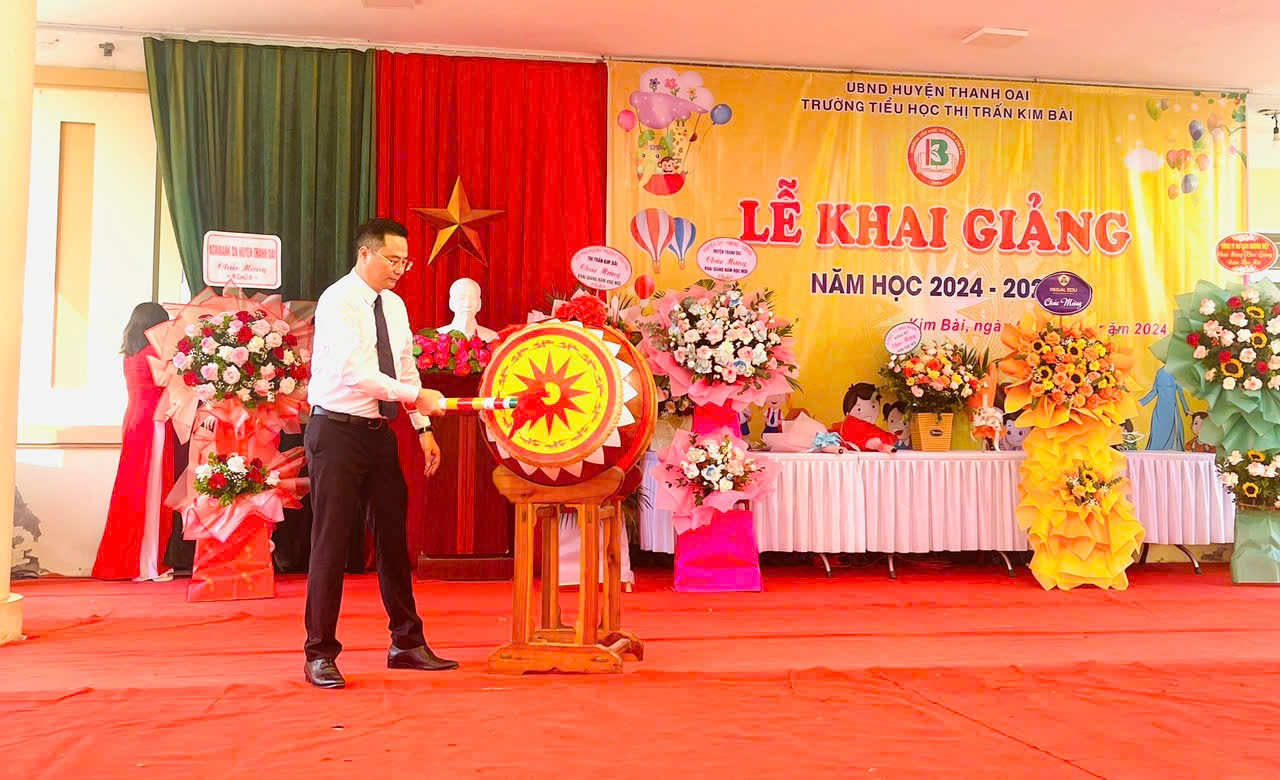 Năm học mới 2024 - 2025 bắt đầu với biết bao mong chờ, háo hức. Các em học sinh, thầy cô giáo trường Tiểu học thị trấn Kim Bàitham dự Lễ khai giảng trực tiếp trong nhộn nhịp cờ hoa, được nghe đọc Thư của Tổng bí thư, Chủ tịch nước gửi ngành Giáo dục nhân dịp khai giảng năm học mới, được gặp lại thầy cô, bạn bè sau mấy tháng nghỉ hè trọn vẹn. Trường Tiểu học thị trấn Kim Bài vinh dự được đón ông Bùi Văn Sáng - Phó bí thư huyện uỷ, Chủ tịch UBND huyện; ông Nguyễn Thu Sơn - Huyện uỷ viên, Chánh văn phòng UBND huyện cùng các đồng chí là chuyên viên phòng Giáo dục, phóng viên báo Kinh tế Đô thị, phóng viên trung tâm văn hóa thông tin huyện về dự và đưa tin. Đến dự Lễ khai giảng của nhà trường còn có ông Hoàng Quốc Đạt - Đảng uỷ viên, Bí thư đảng uỷ, ông Trịnh Quyết Thắng Chủ tịch UBND cùng các ông bà đại diện cho ĐU, HĐND, UBND, UBMTTQ, các đoàn thể, lãnh đạo các thôn, phố thị trấn Kim Bài. 148 em học sinh lớp 1 đã được các ông, bà lãnh đạo thay mặt HU, HĐND, UBND, UBMTTQ huyện Thanh Oai, các ông, bà đại diện lãnh đạo Đảng uỷ, HĐND, UBND, UBMTTQ thị trấn Kim Bài, cô giáo Bí thư chi bộ - Hiệu trưởng nhà trường và đội nghi thức nhà trường cùng ra đón các em học sinh lớp 1 vào dự lễ khai giảng với vòng tay thân thương, trìu mến. Năm học 2023 - 2024, nhà trường đã hoàn thành xuất sắc nhiệm vụ đề ra cụ thể: + Về giáo viên:Thi giáo viên giỏi cấp huyện có 02 giáo viên dự thi: Môn cơ bản có 01 giáo viên đạt giải Nhất huyện, đạt giải Ba Thành phố, môn Mĩ thuật đạt giải Khuyến khích.Kết quả thi bài giảng Elening, kỹ năng công nghệ thông tin cấp huyện: 03 giải Nhì, 01 giải Ba, 03 giải Khuyến khích. + Về học sinh:Hội thi Lịch sử địa lý địa phương huyện Thanh Oai nhà trường đạt giải Nhì. 02 học sinh được giải Khuyến khích cấp Quốc gia môn “Kỹ năng sống”; 06 học sinh giỏi cấp thành phố môn KNS và Vioedu trong đó có 01 giải Bạc; 02 giải Đồng, 03 giải Khuyến khích; 155 em học sinh được công nhận HSG cấp huyện các môn Giao lưu Vioedu, Viết chữ đẹp, Violympic tiếng Anh, Rung chuông vàng, Kỹ năng sống, Trạng nguyên Tiếng anh trong đó có 23 giải Nhất, 31 giải Nhì, 30 giải Ba, 71 giải Khuyến khích. Toàn trường có 139 em học sinh đạt HSG cấp trường các môn Giao lưu Vioedu, Kỹ năng sống. 100% học sinh lớp 5 Hoàn thành chương trình Tiểu học; 100% học sinh lớp 1;2;3;4 Hoàn thành chương trình lớp học. Với những thành đạt được, tập thể nhà trường đã được UBND thành phố Hà Nội tặng Cờ thi đua. Năm học 2024 - 2025, nhà trường có 20 lớp với hơn 800 học sinh. Đây là năm thứ năm nhà trường thực hiện Chương trình giáo dục phổ thông 2018 với nhiều khác biệt trong tổ chức giảng dạy và môn học. Phát huy những kết quả đạt được, năm học mới trường Tiểu học thị trấn Kim Bài tiếp tục đoàn kết, nỗ lực vượt khó, đổi mới sáng tạo để hoàn thành tốt nhiệm vụ năm học đề ra, xây dựng tập thể nhà trường ngày càng vững mạnh. Thay mặt Huyện uỷ, HĐND, UBND, UBMTTQ huyện ông Bùi Văn Sáng - Phó Bí thư huyện uỷ, Chủ tịch UBND huyện đã đánh trống khai trường. “Tiếng trống vang giữa Thanh Oai văn hiến Có Kim Bài, có thị trấn trung tâm Có ngôi trường chứng kiến tuổi thơ ta Hai mươi chín năm, mùa khai trường rực lửa. Tiếng trống giục đàn em thơ chăm học Rèn đức tài xây hạnh phúc tương lai Có ngàn xưa của ông cha vọng lại Hãy vươn lên hỡi gái đảm trai tài.