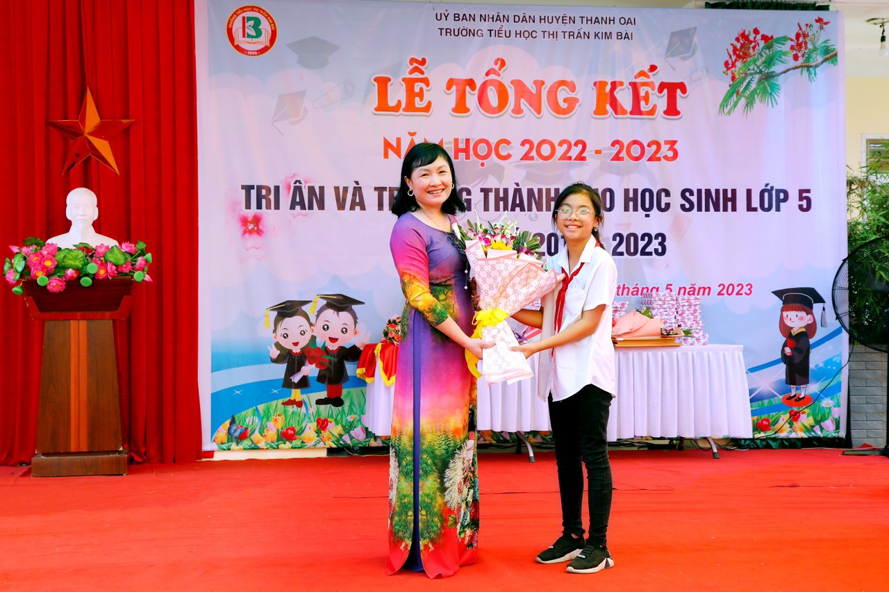 “Nắng Hạ về nhuộm màu hoa phượng đỏ, Một góc trời rực rỡ bức tranh thơ Tiếng ve ngân gợi nhớ tuổi học trò, Dưới tán phượng hẹn hò xa mấy đỗi” Khi ánh nắng ngập tràn từng con phố, trên từng tán là lấp ló màu đỏ của hoa phượng và tiếng ve kêu râm ran là lúc báo hiệu mùa hè về cũng là lúc báo hiệu một năm học đã kết thúc. Trong năm học 2022 – 2023 vừa qua, với sự cố gắng nỗ lực của các em học sinh và sự ân cần nhiệt huyết của các thầy cô giáo, trường Tiểu học thị trấn Kim Bài đã gặt hái được nhiều thành tích xuất sắc. Được sự nhất trí của Phòng Giáo dục và Đào tạo huyện Thanh Oai, của Đảng ủy, UBND thị trấn Kim Bài Hôm nay, trong không khí phấn khởi của những ngày tháng 5 lịch sử, Trường Tiểu học thị trấn Kim Bài long trọng tổ chức Lễ tổng kết năm học 2022 – 2023 nhằm đánh giá toàn bộ quá trình thực hiện nhiệm vụ năm học, đồng thời tuyên dương khen thưởng các tập thể, cá nhân đạt thành tích xuất sắc trong phong trào thi đua “Hai tốt” của nhà trường và tri ân học sinh khối lớp 5 ra trường. Về dự và chỉ đạo Lễ tổng kết năm học, nhà trường rất vinh dự được đón ông Hoàng Quốc Đạt – HUV – Bí thư Đảng ủy, ông Phạm Văn Sinh –ĐUV – Phó chủ tịch UBND, bà Nguyễn Thị Chính – ĐUV – Chủ tịch UBMTTQ cùng các ông bà đại diện các ban ngành đoàn thể thị trấn Kim Bài, các ông bà lãnh đạo đại diện các tổ, thôn phố, các ông bà trong Ban thường trực hội CMHS, các thầy cô giáo và 859 em học sinh trong trường. Nhà trường đã nhận được những tình cảm và những bó hoa tươi thắm mà quý vị đại biểu dành cho nhà trường nhân buổi lễ tổng kết năm học. Lãnh đạo thị trấn tặng hoa nhà trường Để ghi nhận lại 1 năm phấn đấu công tác, học tập và rèn luyện của giáo viên và học sinh nhà trường, cô giáo Lê Thị Kim Thái - Bí thư chi bộ - Hiệu trưởng nhà trường đã thông qua báo cáo tổng kết năm học. Cô giáo Lê Thị Kim Thái - Bí thư chi bộ - Hiệu trưởng nhà trường đọc báo cáo tổng kết năm học.