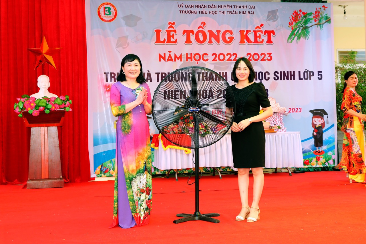 Buổi lễ tổng kết năm học đã diễn ra trong không khí trang trọng nhưng cũng không kém phần ấm áp, mang lại nhiều cung bậc cảm xúc. Lắng nghe những lời chia sẻ, tâm sự đầy xúc động của các thầy cô, bậc phụ huynh và các em học sinh chắc hẳn ai cũng bồi hồi nhớ lại những kỉ niệm đáng nhớ của năm học này, đó có thể là tiếng gọi nhau mỗi buổi đến lớp, là tiếng giảng bài của thầy cô, là những giọt nước mặt những cũng có thể là những nụ cười,... dù kỉ niệm ấy có là gì thì chắc chắn đó sẽ là những hồi ức đẹp đẽ nhất của thời học sinh hồn nhiên trong sáng. Cũng tại buổi lễ, nhiều thành tích của thầy và trò trường Tiểu học thị trấn Kim Bàiđã được tôn vinh. Những giải thưởng ấy chính là sự nỗ lực, phấn đấu không ngừng trong suốt một năm vừa qua. Bà Nguyễn Thị Chính - ĐUV- Chủ tịch UBMTTQ thị trấn và cô giáo Lê Thị Kim Thái - Bí thư chi bộ - Hiệu trưởng nhà trường trao phần thưởng cho các em học sinh